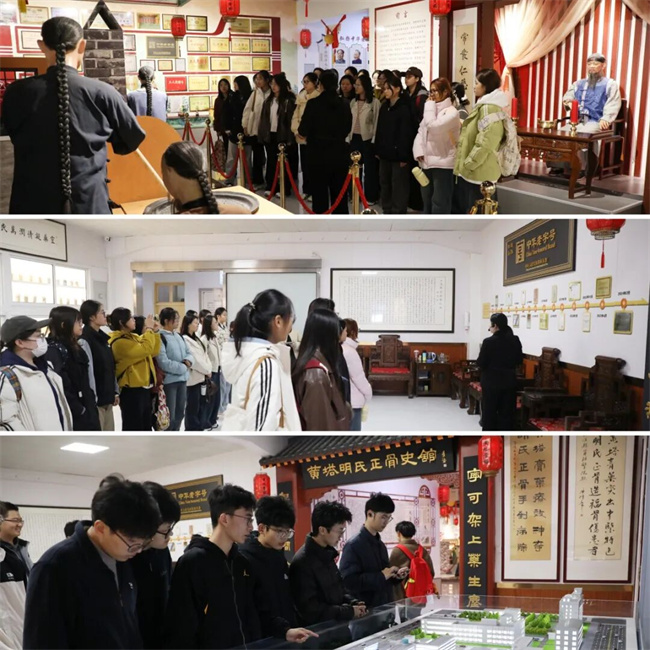 随后,师生们移步至黄塔明氏正骨史馆。讲解员介绍了我院黄塔膏药近年来相关科研成果,其中提到在2024年2月份黄塔膏药被国家商务部等五部委授予中华老字号。结合馆内陈设的实物和照片讲解员详细讲解了黄塔膏药、黄塔明氏正骨历经15代传承、360多年的发展历史,同时回顾了滑县骨科医院建院42年的发展历程。