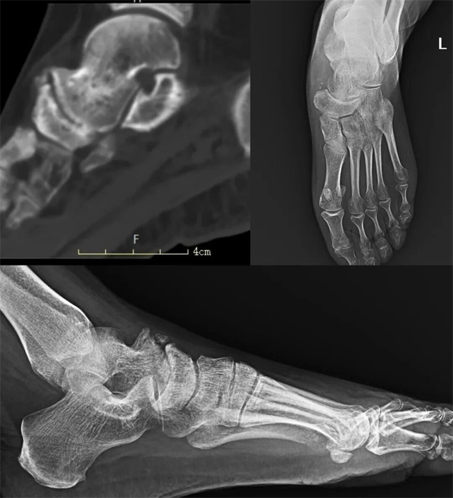 二、患者武某某,男,50岁,患者右踝部肿胀疼痛,走路跛行,踝关节周围肿胀,外踝及距舟关节压疼明显。为求进一步治疗,来到我院请专家会诊,通过各位专家会诊查体、查看影像资料并细致认真的分析后,诊断为:距舟创伤性关节炎,意见:关节融合术。