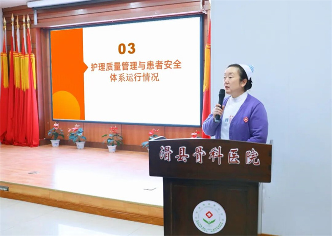 会议第一部分,由副院长兼护理部主任马芳静作《2025年度滑县骨科医院护理工作总结报告》。报告围绕七大维度系统回顾了一年来的工作成效与思考:一是聚焦年度重点任务,展示关键成果完成情况;二是分析护理人力资源配置与临床工作负荷,优化人力结构;三是深化护理质量管理,筑牢患者安全体系;四是完善培训体系,持续推进人才梯队建设;五是深化优质护理服务内涵,提升患者就医满意度;六是总结特色创新实践,凝练护理工作亮点;七是客观剖析存在问题,明确2026年度改进方向与发展规划。报告内容详实、数据清晰,既有全局视野,又具专业深度,为下一步护理工作指明了路径。